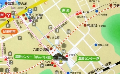 左)「ひらやホテル」ここで入浴、打上。右)ホテルは地図の19番の所です。