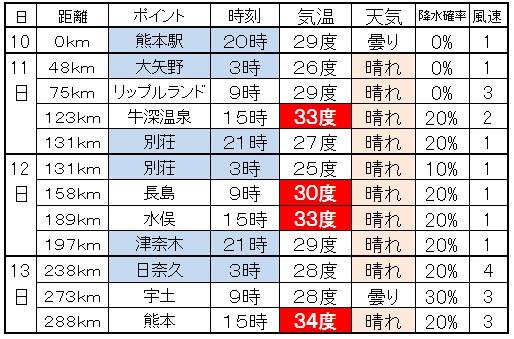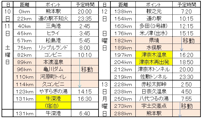 A11時〜4時は休憩する。出水の温泉で休憩を取る(暑さ次第)。
