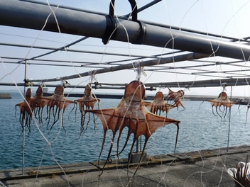 なんと!8本足を広げたユーモラスな姿の干しダコ!初めて見ました。天草の夏の風物詩となるといいですが・・