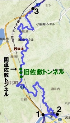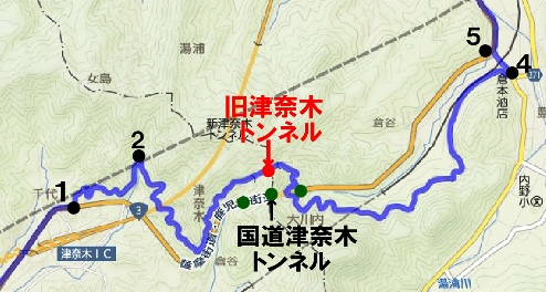 <旧津奈木トンネルへの道>酒造亀萬の前を通り、@から山道に入りDから国道に戻ります。その間7.4km。