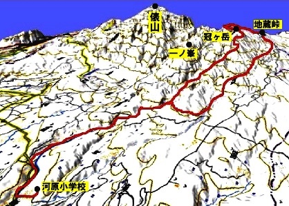 コースの3D図(ちょっと不正確)。地蔵峠までは上りの連続、冠ヶ岳からは下りの連続。