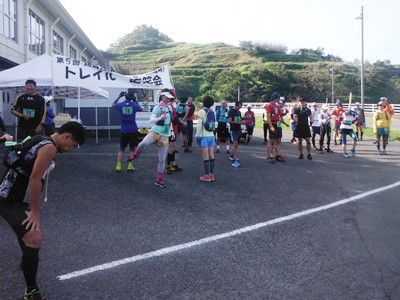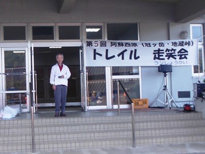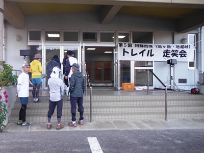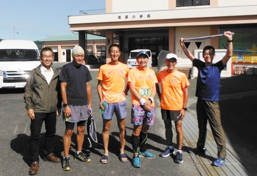 会場は「西原村立河原小学校」。運動場に車を停めて体育館前で受付。参加者は52名(32km42名、21km10名)。