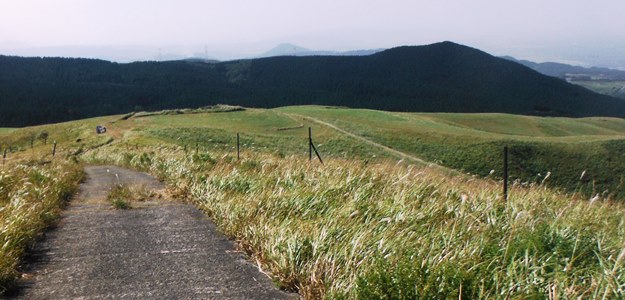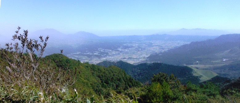 ここからの阿蘇の眺め。火山灰が舞っているため、山頂付近ははっきり見えず。