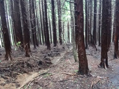 飛ばそうにも、道が木の根っこだらけ、岩石ゴロゴロで走れない。下りなので転倒したら大ケガします。