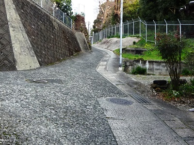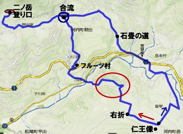 右(赤線)が急峻コース(さるすべり)。その先でまた右へ曲がる道があります。これは山の後ろに回る道で遠いです。