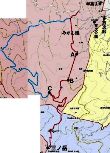Cに行く途中に鉄塔があり、そこを右折(青線)すると近道ですが、道が荒れていたので行かず。