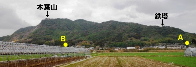 A:木葉山正規登山道入り口。B:急登参道登山口。