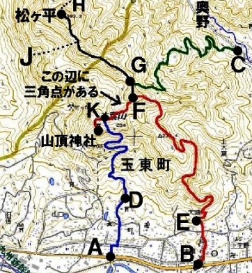 B=ローソン、E=登山口、F=松ヶ平との分岐、K=帰りみち分岐、D=鳥居、A=登山口