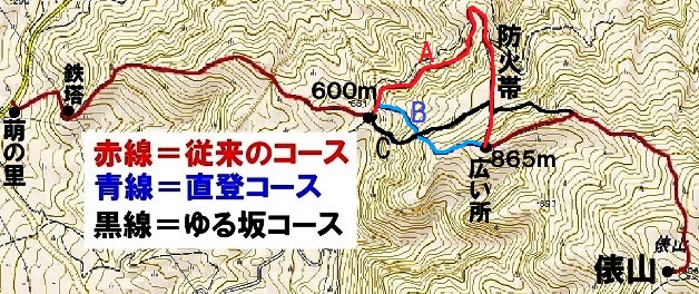 ●A(赤線)=防火帯を通る従来のコース。時間かかる。坂がきつい。山頂まで60分。