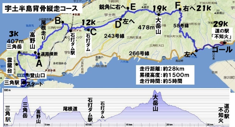 コース図:三角駅スタート→雲竜台→三角岳(406m)→高野山(262m)→石打ダム→大岳山(478m)