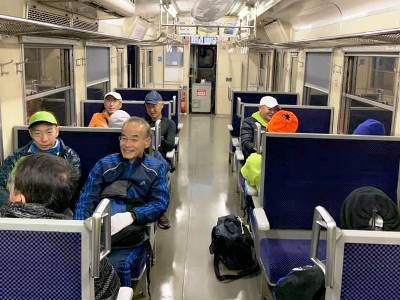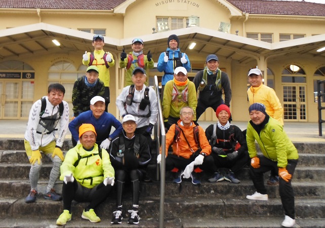 参加者は16名(サポート2名)。三角駅前で記念撮影。