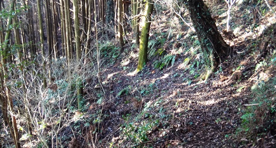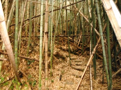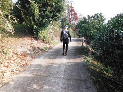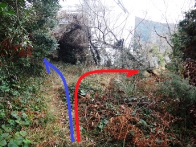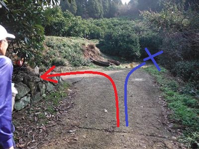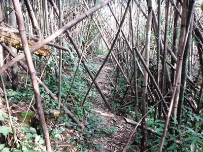 店を出て100mで左折。畑の横を通って奥の藪に入ります。初心者にはこの道はわからないでしょう。道はもうジャングル