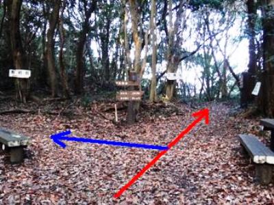 展望所から5分で天翔台(青矢印)への分岐点に出ます。ここはまっすぐです。