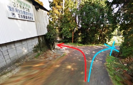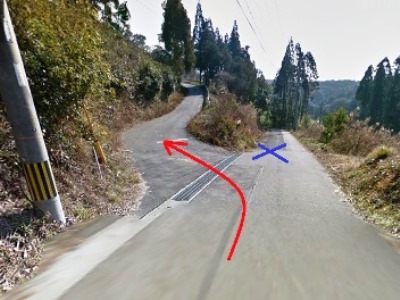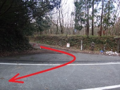 道路横断して5分後に三叉路に出ます。そこはまっすぐではなく「右折」です。さらに50m先は「左へ」上ります。