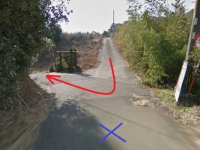 10分ほどで鉄柵に出ます。道は青線のように左カーブですが、そこを右に行き、道路に出ます。
