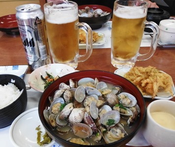 13:30より宴会開始。名物貝汁定食+生1杯、美味でした。