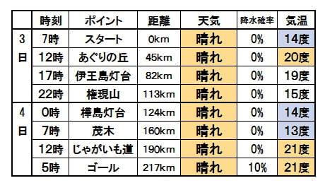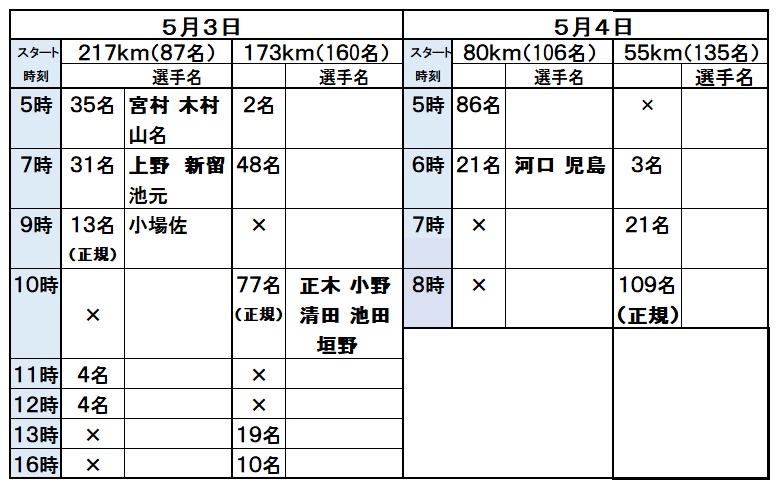 スタート時間は種目、走力によって14に分かれています。今日スタートするのは217kmと173kmの147名。