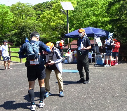 右:ゼッケンのQRコードをチェックしてもらい、完踏成立!!やったー!